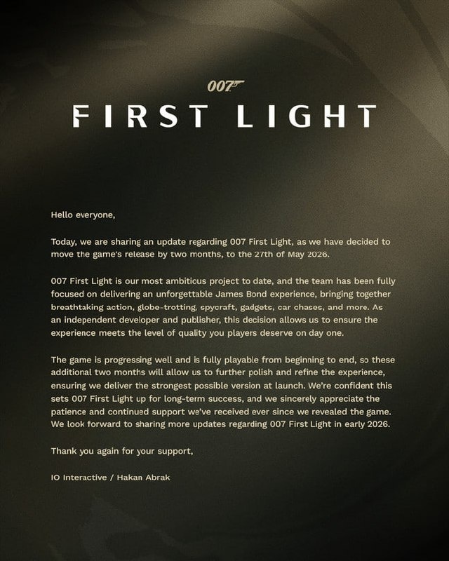007 First Light перенесли: игра выйдет на 2 месяца позже 27 мая 2026 года. Разработчики сообщили, что им требуется больше времени на доработку игры. CtrlAltDelights- подписаться