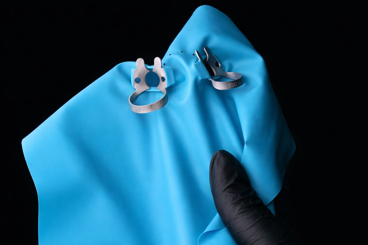 В качественной стоматологии тщательная изоляция рабочего поля — не опция, а обязательное условие. Именно для этого используется коффердам — система, которая изолирует один или несколько зубов от ротовой полости. Коффердам — это изоляционная стоматологическая система, которая: Система включает в себя эластичный латексный или безлатексный платок, который фиксируется на зубе с помощью специального устройства — клампа и полностью изолирует область вмешательства. Современные пломбировочные материалы требуют максимально сухой среды. Даже микроскопическое попадание слюны может снижать сцепление материала с зубом — пломба теряет герметичность, что приводит к микроподтеканию, повышенной чувствительности и развитию вторичного кариеса под пломбой. Коффердам даёт врачу: Это повышает точность выполнения манипуляций и качество итогового результата. Инструменты, материалы и растворы не попадают в горло и дыхательные пути. Пациенту не нужно постоянно глотать, напрягаться или держать рот в неудобном по
