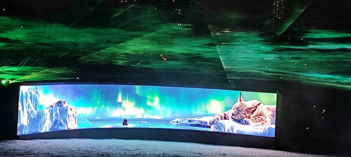 Мы посетили территорию дворца пионеров на Воробьевых горах, где развернулся парк инсталляций животных и искусственное северное сияние. Фото не передают всего великолепия, но ощущение сказки сопровождало нас на всём маршруте. Итак, мы зашли от Ленинского проспекта, доехав на такси до Университетский проспект дом 6 корпус 1, где находится край территории Дворца Пионеров и горки, образующие котлован. В этом месте и находится главная точка инсталляций, огромная световая панорама с северным сиянием и всплывающими из океана периодически животными, то медведь, то тюлень, то стая птиц. над этим экраном расположены салатовые лучи и пускается пар, которые создают эффект северного сияния. Зрелище завораживает. К сожалению, сфотографироваться рядом не очень получается, изображение даёт рябь, а фигура человека получается тёмной. Но ведь не обязательно всё запечатлеть на камеру, что-то можно просто сохранить себе на память. Рысь нам удалось сфотографировать, дальше изображение расслоилось. На деревь