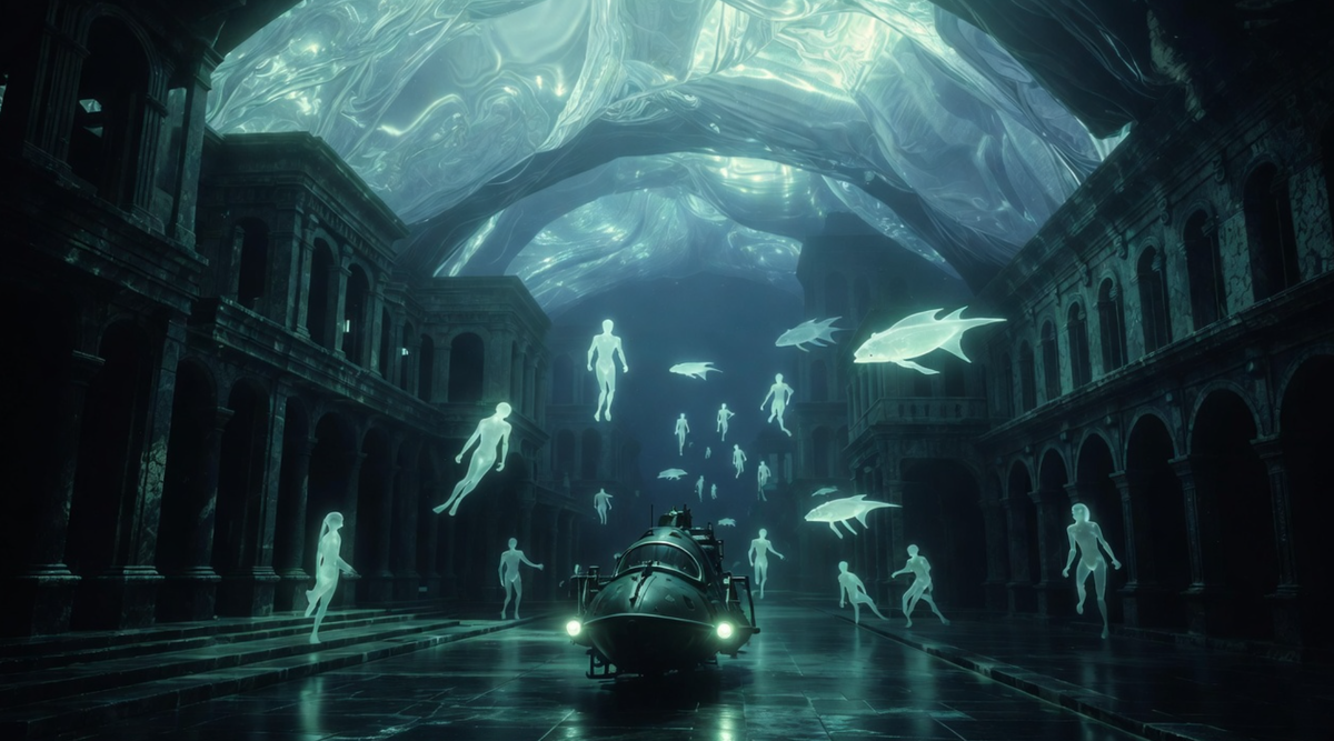Они находились на дне гигантского подводного купола, накрывавшего, как колпак, огромную территорию. Над их головами, на головокружительной высоте, переливалась и слегка колыхалась та самая радужная пленка, удерживающая многокилометровую толщу океанской воды. А под ней простирался город. Не просто руины, а величественный Аквилон. Широкие улицы, вымощенные темным, отполированным временем камнем, расходились лучами от центральной площади. По их сторонам вздымались здания причудливой архитектуры — стройные башни, похожие на сталагмиты, дворцы с ажурными арками, сложенными из кораллового известняка, и огромные общественные здания, стены которых были покрыты фресками, еще хранившими следы фантастических красок. Но город был мертв. Мертв и погружен в вечный, сумеречный полдень. Свет, проникавший сквозь купол, был призрачным, рассеянным, как в самый пасмурный день, и не отбрасывал четких теней. Тишина стояла абсолютная, гнетущая, нарушаемая лишь тихим шипением их собственных систем жизнеобеспечения.