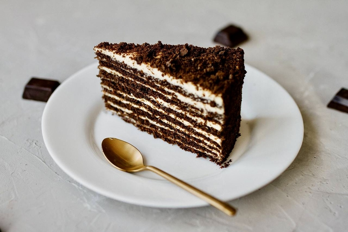 Ингредиенты: Для коржей: ▫️мука — 350 г ▫️мед — 70 г ▫️какао-порошок — 30 г ▫️разрыхлитель — 5 г ▫️сода — 5 г ▫️сахар — 150 г ▫️сливочное масло — 100 г ▫️яйца куриные — 2 шт. Для крема: ▫️сливочное масло — 300 г ▫️сметана 20% — 525 г ▫️сахар — 180 г ▫️яйца куриные — 2 шт. ▫️крахмал — 30 г ▫️ванильный экстракт — по вкусу Способ приготовления: 1. Просеянную муку смешать с какао-порошком и разрыхлителем. 2. В кастрюле соединить сливочное масло, мед, сахар и поставить на водяную баню. 3. К растопленной смеси добавить взбитые венчиком яйца и размешать. 4. Добавить соду. 5. И проварить, помешивая, около 10 минут. 6. Смесь влить в муку, смешанную с какао, и замесить тесто. Оно будет липким, но по мере остывания станет более плотной консистенции. 7. Оставить тесто на 15 минут при комнатной температуре. 8. Разделить тесто на 8 частей и поставить в холодильник на полчаса, прикрыв пленкой. 9. Рабочую поверхность посыпать мукой и раскатать одну часть теста в круг толщиной 2–3 мм. 10. Перенести на