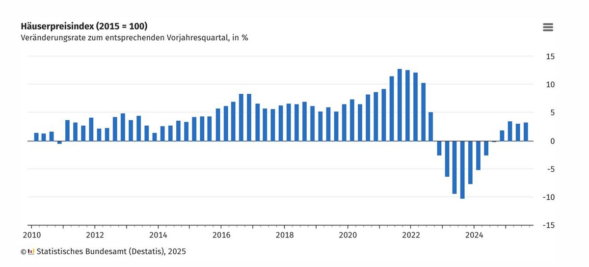 Уже целый год… или другими словами, 4 квартал подряд (данные пока что за 3 квартал 2025 года). Несмотря на разговоры об охлаждении, цены на жильё в Германии снова растут. Посмотрим на предварительные данные от статистического ведомства Германии Destatis: В городах-землях (Берлин, Гамбург и Бремен) квартиры подорожали в среднем на 5%. Если брать ТОП-7 крупнейших городов (Берлин, Гамбург, Мюнхен, Кёльн, Франкфурт, Штутгарт, Дюссельдорф), то дома подорожали на 2,7%, а квартиры: +2,8% год к году. В густонаселённых сельских районах квартиры подорожали на 5,5%. Недавно мы уже писали, что цены в Германии выросли в 16 из 20 крупнейших городов. Но о буме говорить ещё рано: аналитики GlobalPropertyGuide прогнозируют очень осторожное восстановление. Цены хоть и растут, по-прежнему сильно ниже своих пиковых значений. Что фиксируют эксперты? Слово Виталию Чупину, Campus Consulting: Рынок безусловно пошел вверх, но по-немецки осторожно, и в цифрах мои ощущения полностью совпадают с приведенной оценк