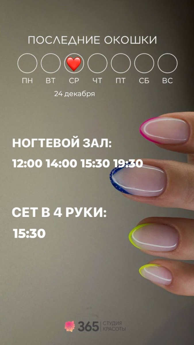 ❤️🌺 команда365 #красота #наслаждение #забота #зима #любовь #мечтысбываются #радость #возможности ЧТО МОЖНО УСПЕТЬ СДЕЛАТЬ 24 декабря 2025 года: Ногтевой зал: 12:00 14:00 15:30 19:30 Сет в 4 руки: 15:30 Парикмахерский зал: 15:00 17:00 18:00 Оформление бровей и ресниц: 12:00 13:00 17:00 18:00 Косметология/шугаринг: ближайшая запись на 25 декабря ЗАПИСАТЬСЯ МОЖНО ЛЮБЫМ УДОБНЫМ СПОСОБОМ: 👉🏻 Сообщение в Whats'app https://wa.me/79663654477 👉🏻По телефону +79663654477 👉🏻Онлайн запись https://n286444.yclients.com/ #команда365 #красота #наслаждение #забота #зима #декабрь #любовь #мечтысбываются #радость #возможности