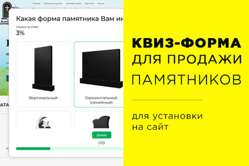 Наша услуга предоставляет квиз-форму для заказа памятников, которую можно легко установить на ваш сайт. Форма интегрирует серию вопросов, аналогичных тем, что задает менеджер при общении с клиентом, позволяя пользователям вашего сайта указывать предпочтения по памятнику. Каждый вопрос может поощрять скидкой — процентной, фиксированной или вовсе отсутствующей. После заполнения пользователь отправляет заявку на вашу почту с перечнем интересов, что упрощает обработку запросов.