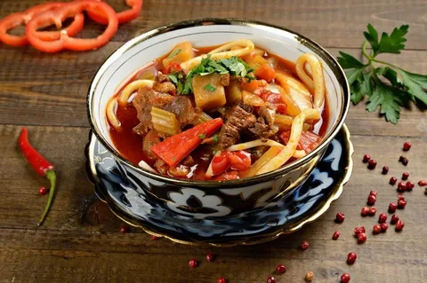 Лагман из говядины — это сытное, ароматное и очень вкусное блюдо среднеазиатской кухни. Его основа — домашняя лапша (собственно, "лагман"), густая мясная подлива "ваджу" с овощами и насыщенный бульон. Вот подробный рецепт классического лагмана из говядины. Рецепт разделен на три ключевые части: лапша, соус (ваджу) и сборка. Часть 1: Домашняя лапша для лагмана (или альтернатива) Ингредиенты: · Мука пшеничная — 500 г · Вода — 250 мл · Яйцо — 1 шт. · Соль — 1 ч. л. · Растительное масло — 1-2 ст. л. (для смазывания) Приготовление: 1. В миске смешайте муку с солью, сделайте углубление, влейте яйцо и воду. 2. Замесите тугое, эластичное тесто. Вымешивайте не менее 10 минут. 3. Смажьте тесто маслом, заверните в пищевую пленку и оставьте отдыхать при комнатной температуре минимум на 1 час. 4. Раскатайте тесто в большой пласт толщиной 2-3 мм. Сильно посыпьте мукой, сверните в рулет. 5. Острым ножом нарежьте рулет на тонкие полоски (3-4 мм). Разверните каждую полоску, слегка присыпьте мукой, что