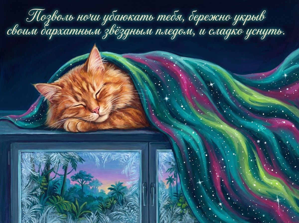 Отпусти все тревоги ушедшего дня, пусть они растворятся в тишине, словно тихий выдох на морозном стекле. Ты заслуживаешь этот покой, это обволакивающее тепло, что разливается по телу, подобно самому нежному мурчанию. Каждое твоё чувство, каждая мысль сегодня была важна, а сейчас пришло время для отдыха и восстановления сил. Вслушайся в безмолвие — в нём рождается волшебство снов и обещание нового, светлого утра. Позволь ночи убаюкать тебя, бережно укрыв своим бархатным звёздным пледом, и сладко уснуть.