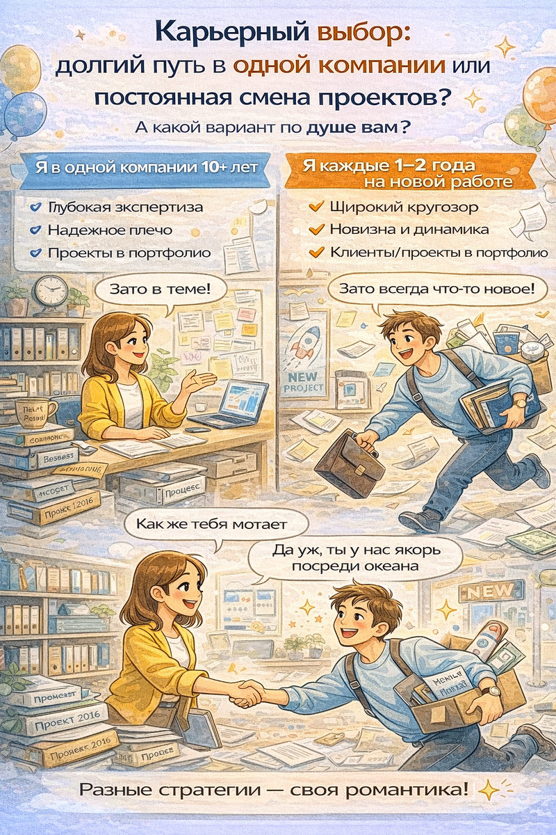 На днях у меня случилась неожиданная и очень показательная встреча. Мы пересеклись с человеком, с которым работали вместе более 15 лет назад на одном проекте. Тогда мы были на одном уровне, решали схожие задачи, обсуждали дедлайны и сложности внедрения. Прошло много лет, и каждый из нас прошел свой профессиональный путь. Разговор быстро перешел в плоскость работы и карьеры. И здесь оказалось, что наши взгляды на развитие принципиально разошлись. У моего собеседника четкая позиция: работать в одной компании дольше двух лет — это застой. По его мнению, специалист должен постоянно менять организации, проекты, иногда даже сферы деятельности. Только так, считает он, можно сохранять остроту мышления, конкурентоспособность и не «зарастать мхом». Мой путь — противоположный. Все это время я работаю в одной компании. При этом нельзя сказать, что я делала одно и то же. Менялись должности, зоны ответственности, масштаб задач, роли в проектах. Я росла внутри одной области, углубляясь в нее, накапл