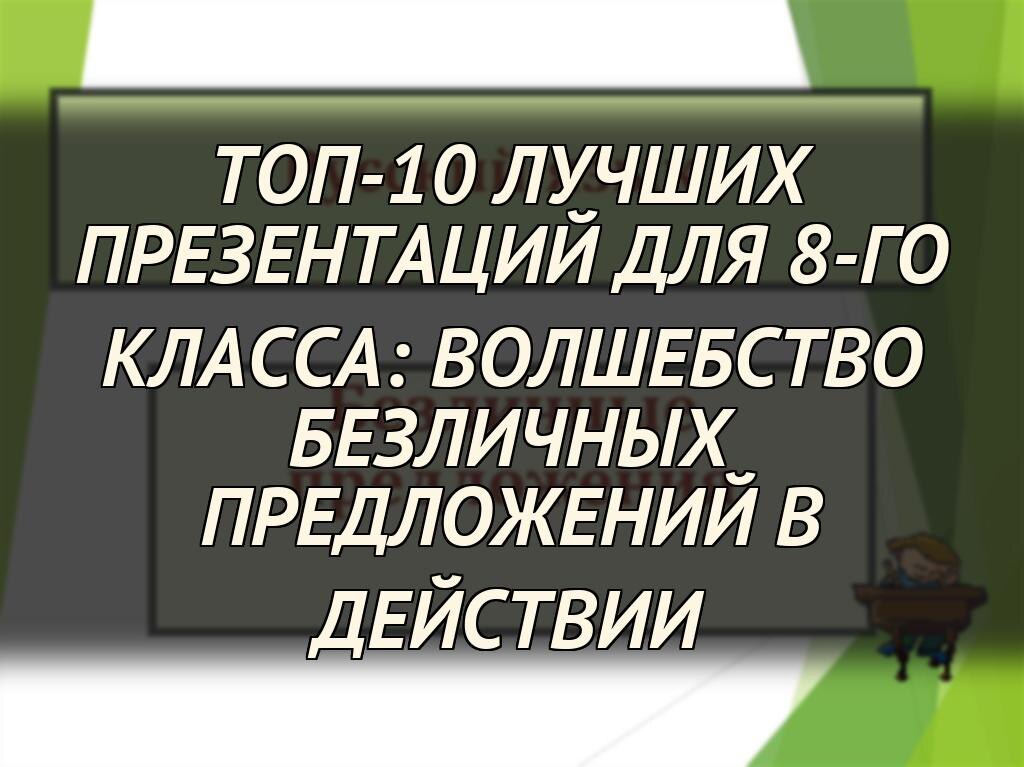 Презентации из ТОП-10, включая 'Безличные предложения (8 класс)' и 'Безличные предложения. Односоставные предложения', доступны на образовательных платформах вроде Кэмпуса, где они организованы по темам для 8 класса. Ищите их в разделах грамматики русского языка для общего образования.