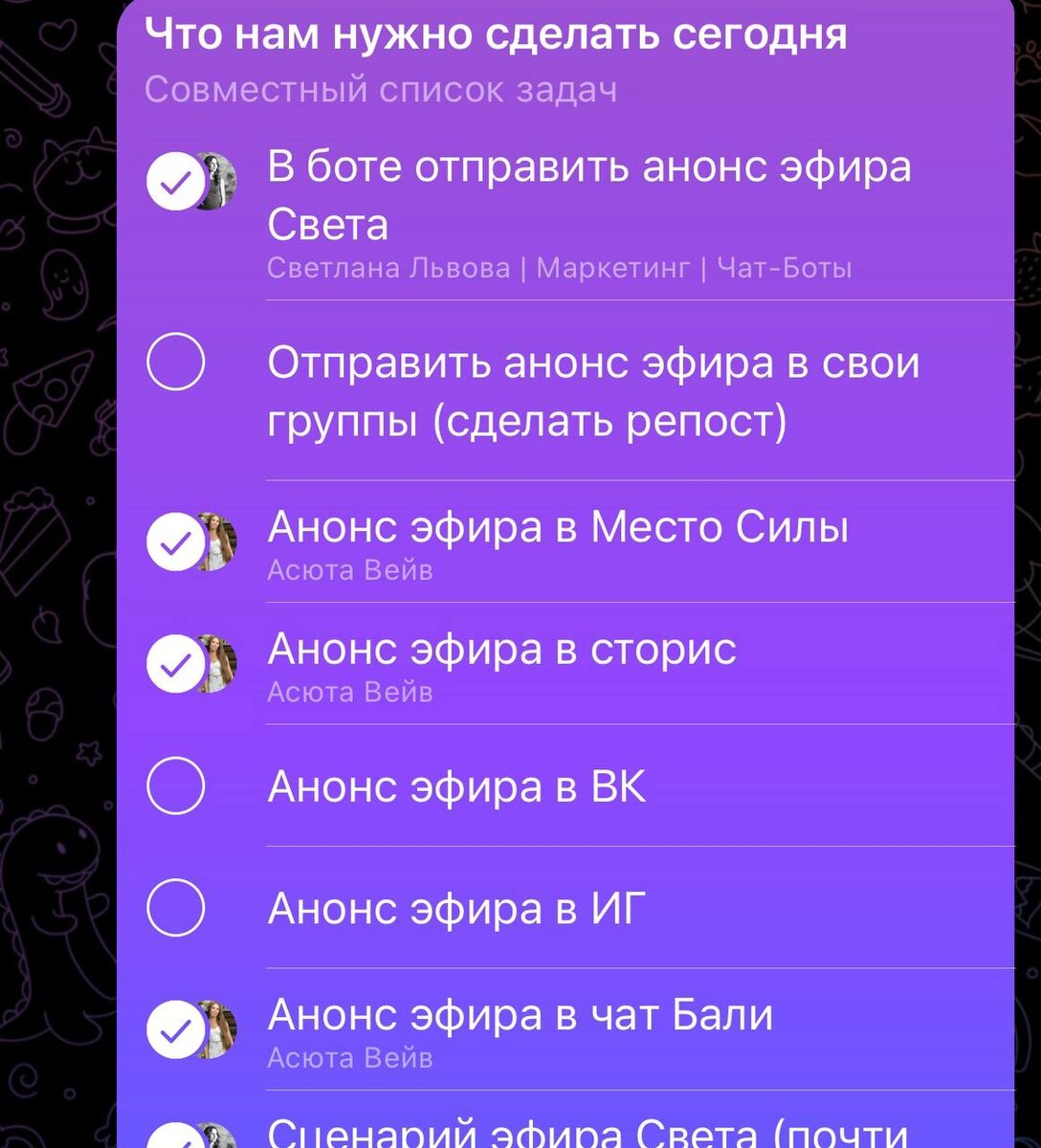 Накануне — это всегда миллион мелких задач: от проверить бота до сделать анонс в дружественном чате. Держать это в голове нереально, писать в личку — потеряется в потоке сообщений. И как же для таких случаев удобна функция в ТГ To-Do лист для совместных задач ☺️Накидали список, распределили, кто за что отвечает. Всё перед глазами. Главное, не нужно тащить эксперта в сложные планировщики типа Trello. Просто, быстро и ничего не потеряется. А вы знали об этой функции в ТГ? #нувсёяначала100постов пост 25