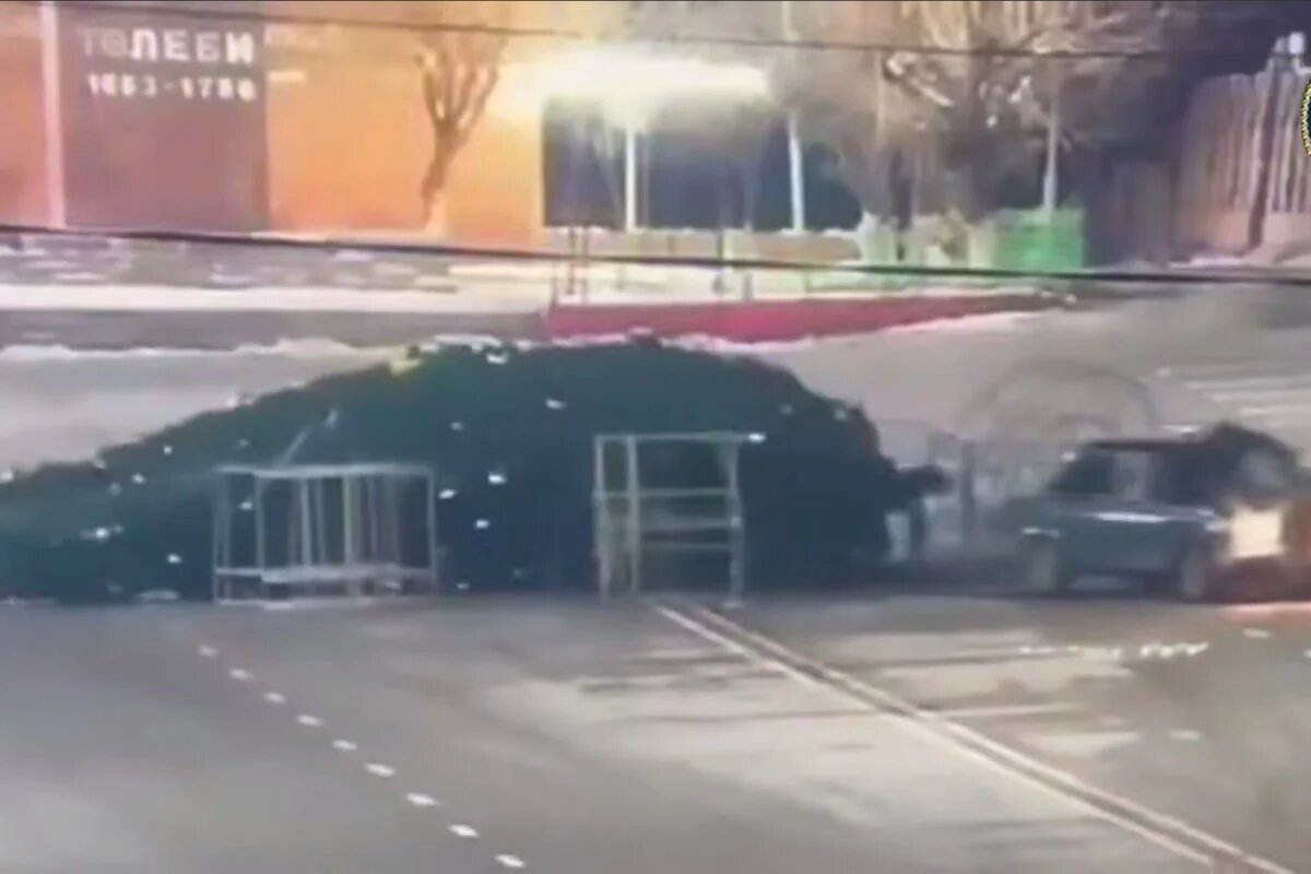 Водитель тараном свалил главную новогоднюю елку в Туркестанской области (ВИДЕО)