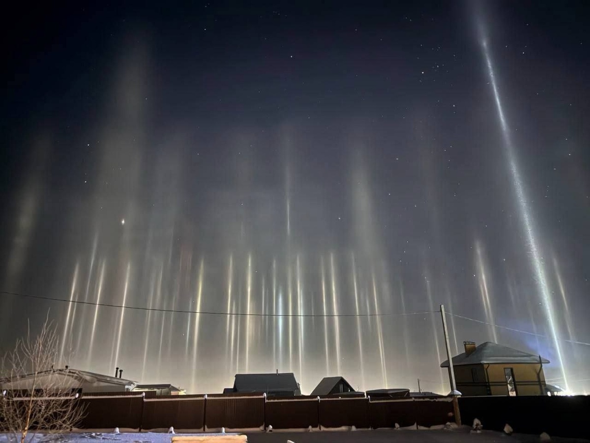 » Жители заметили в небе редкое природное явление — вертикальные лучи света, похожие на колонны. Это красивое оптическое явление возникает в морозную погоду, когда свет фонарей или солнца отражается от плоских кристаллов льда в воздухе.