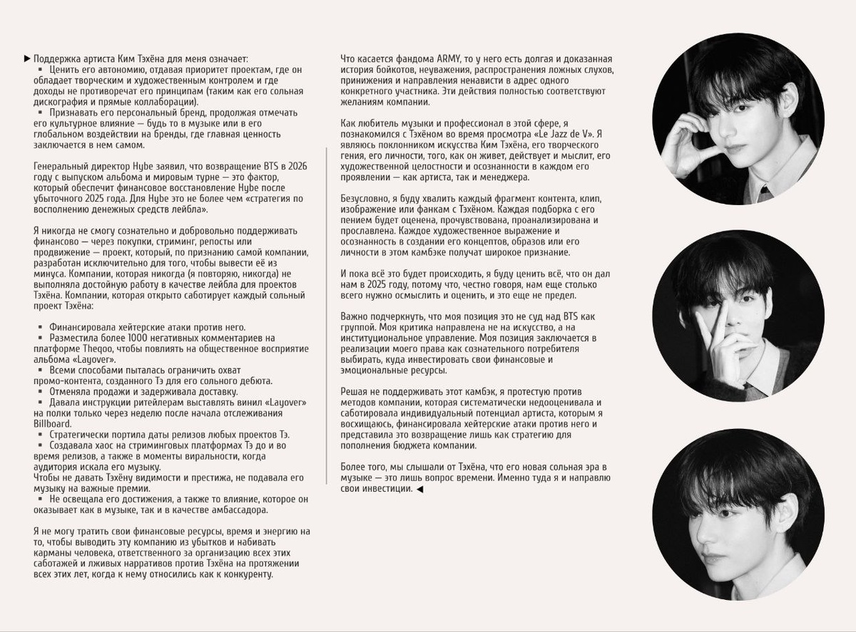 Я не готова тратить свое время, энергию и деньги на то, чтобы выводить из убытков компанию и набивать карманы людей, ответственных за годы саботажа и лжи в отношении Тэхёна. Внутри собственного фандома к нему слишком часто относились как к конкуренту, а не как к части команды.
