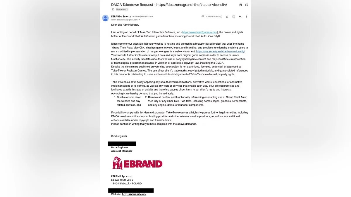 ⚡ Разработчики «Grand Theft Auto: Vice City в браузере» получили запрос по DMCA от Take-Two Interactive и Rockstar Games