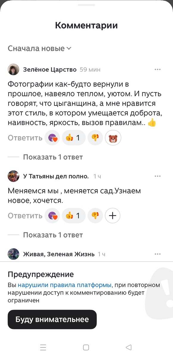 В понедельник утром выяснилось, что мне ограничили возможность писать комментарии. Я якобы нарушила правила Дзена. Возможно ли, чтобы садовод-божий