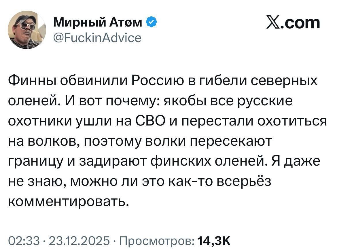 Дорогие жители Финляндии, а вы представляете, что будет, когда наши охотники вернутся с СВО? - все волки удерут к вам через границу и задерут всех ваших оленей и домашний скот; - русские охотники перейдут с ружей на дроны и будут мелкими дронами выслеживать оставшихся оленей, а тяжелыми тащить их туши на российскую территорию; - Финляндия лишится основной белковой мясной пищи и будет вынуждена перейти вместе с немцами и французами на фальшбургеры из насекомых; - У вас от такой пищи разовьются дополнительные лапки и усики, а у некоторых - крылья и вы сможете составить основу новой демократической общности чешуйчатокрылых чухонцев. Предлагаю обсудить это на очередной сессии ООН. Благо я уже научилась там у вас выступать.