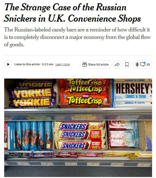 ». «Батончики Snickers российского производства нашли в Лондоне», — пишет NYT. И это несмотря на «широкомасштабные торговые ограничения», отмечает газета. В ответ на вопрос о появлении в британских магазинах Snickers в обёртке с русскими словами производитель Mars Wrigley говорит, что не может помешать посредникам покупать Snickers в РФ, сообщается в материале. 🌐 За Русский Мир©Резервный📣Наш Чат✔️Подпишись‼️