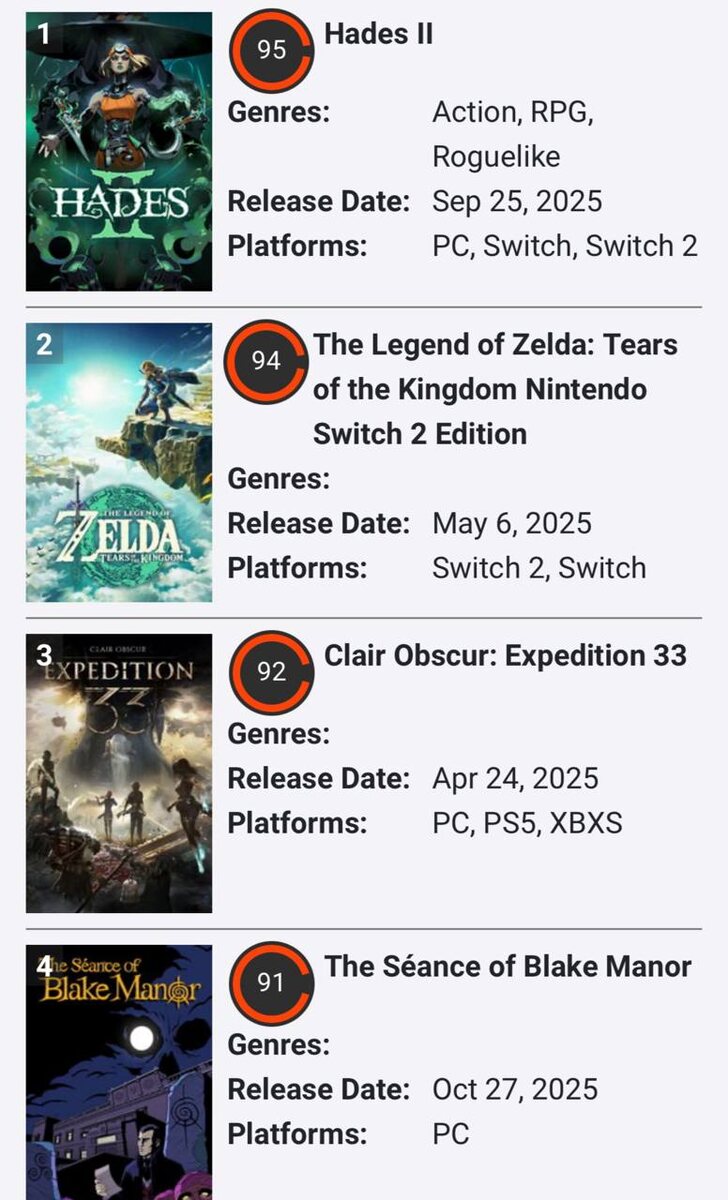 В список попали только тайтлы с самыми наивысшими оценками. Среди них: 1. Hades II (95 баллов); 2. The Legend of Zelda: Tears of the Kingdom Nintendo Switch 2 Edition (94 балла); 3. Clair Obscur: Expedition 33 (92 балла); 4. The Séance of Blake Manor (91 балл); 5. Donkey Kong Bananza (91 балл); 6. Hollow Knight: Silksong (91 балл); 7. Split Fiction (91 балл); 8. Trails in the Sky 1st Chapter (90 баллов); 9. Simogo Legacy Collection (90 баллов); 10. Death Stranding 2: On the Beach (90 баллов). Сохраняем список для прохождения на каникулах. CtrlAltDelights- подписаться