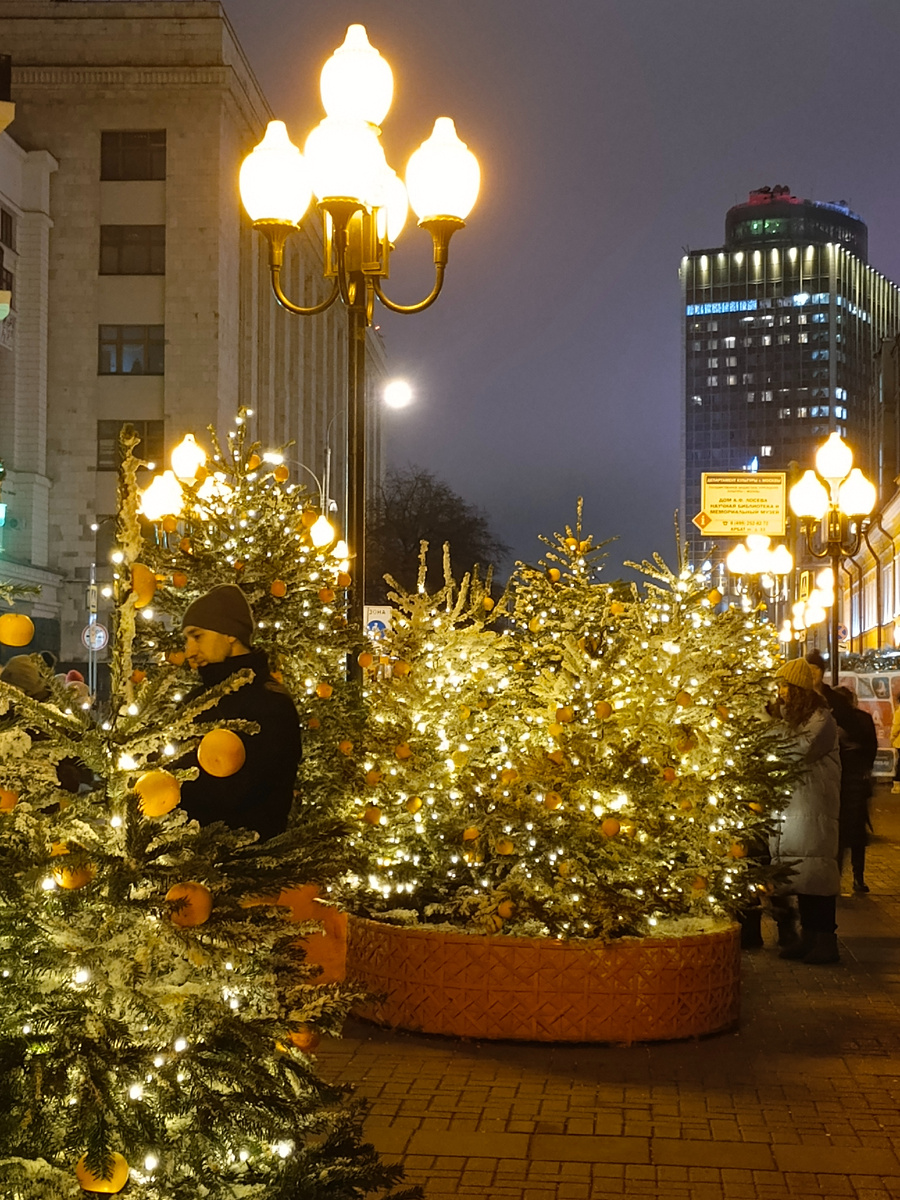 Москва перед любым праздником невероятно красива, но Новый год - это всегда феерия красок и атмосфера волшебства. Не верите? Смотрите сами! Начнем с Арбата - в этом году там поселилось мандариновое настроение: В доме, где жил когда-то Пушкин, всегда украшают балкон: В этом году мандариновые елки дарят отдыхающим радость и хороший фон для фотографий: Местные магазинчики тоже сделали акцент на новогодних игрушках и товарах: Мне кажется, однажды я куплю такого большого Щелкунчика, не удержусь :-) А это витрина парфюмерной "Новой Зари": Украшено все, что можно и неможно: Надо будет обязательно там побывать, в следующий раз. Даже развалы с картинами превратились в мандариновые шатры: Посмотрите на видео, как это смотрится вживую. Ну и хит этого года на Арбате - весы: На левую чашу встает турист, а на правой остаются мандарины. Так что можете измерить свой вес в мандаринах :-). В выходные, правда, такая очередь, что мы стоять не стали, сразу отправились дальше. Ну а в центре Арбата стоит