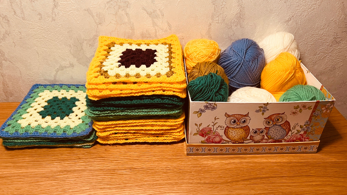 Напомню, что я вяжу этот плед Бабушкиным квадратом, квадраты все цветные, из пряжи Пехорка «Детская новинка», крючок номер 3.