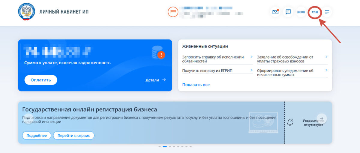 Выполните вход в ЛК ИП с помощью ЭЦП. Перейдите во вкладку АСУН в правом верхнем углу как это показано на картинке.