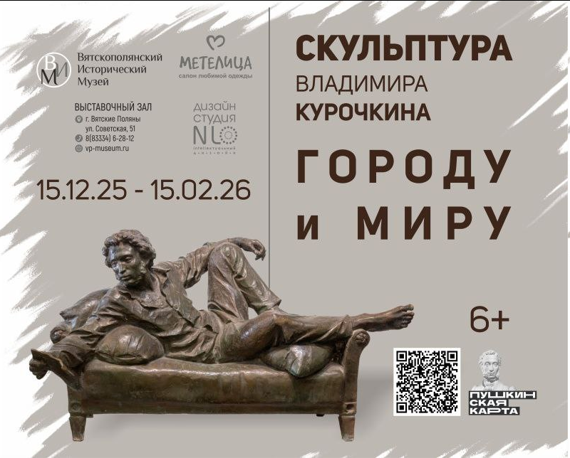 В выставочном зале Вятскополянского исторического музея открылась выставка «Городу и миру» известного российского скульптура, уроженца Вятских Полян, кавалера золотой медали Российской Академии Художеств и выпускника местной художественной школы - Владимира Курочкина. На выставке представлено около 30 скульптур в разных материалах: бронза, композит, мрамор, гипс. Экспозицию дополняют фотографии скульптур и памятников, созданных автором и установленных в городах России. Владимир Курочкин — представитель традиционной русской реалистической школы, одной из важнейших характеристик которой является внутренняя духовность образа. В его работах следование художественным традициям сочетается с современным пластическим мышлением. Мастер работает в жанрах реалистического портрета, монументальной, станковой, мемориальной и парковой скульптуры. Владимир Борисович - автор многих произведений. В Вятских Полянах тоже есть его работы - это бюсты Ф.И. Трещеву и Г. С. Шпагину.