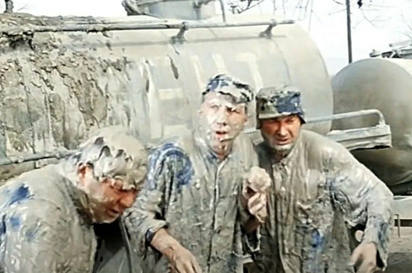 Вот только Савелий Крамаров испугался, поэтому он наотрез отказался лезть внутри цистерны. Поэтому сцену отсняли без него. И если вы обратите внимание, то из цистерны вылезают только Леонов и Вицин, после чего кадр меняется, показывая нам верблюда. После этого мы видим уже троих измазанных героев.