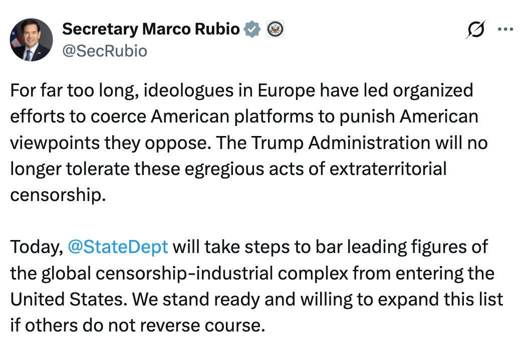 ‘The Trump Administration will no longer tolerate these egregious acts of extraterritorial censorship’