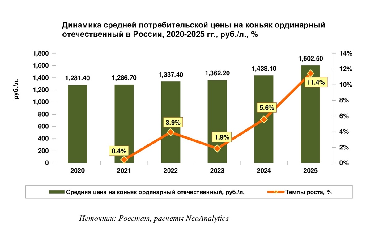 В ходе ежемесячного мониторинга розничных (потребительских) цен на коньяк ординарный отечественный, проведенного NeoAnalytics, выяснилось, что в последние шесть лет динамика индексации средних розничных цен на коньяк ординарный отечественный существенно ускорилась. В 2025 г. показатель средней цены достиг своего пика. В 2025 г. средняя розничная цена на данный вид коньяка на прилавках российских магазинов выросла на 11,4% в сравнении с аналогичным показателем годом ранее и составила 1 602,5 руб./литр. Годом ранее средние цены за год выросли на 5,6%. Для сравнения, еще в 2020 г. коньяк ординарный отечественный в среднем в России стоил в районе 1 300 руб./литр. Если смотреть динамику периода 2020-2025 гг. по месяцам то видно, что в период 2020-2021 гг. цена была на одном уровне все два года. Резкий скачок цен произошел в марте 2022 г., но в конце года цена несколько скорректировалась. 2024 г. начался незначительной индексацией. Но 2025 г. отличился критическим подорожанием в ретроспек