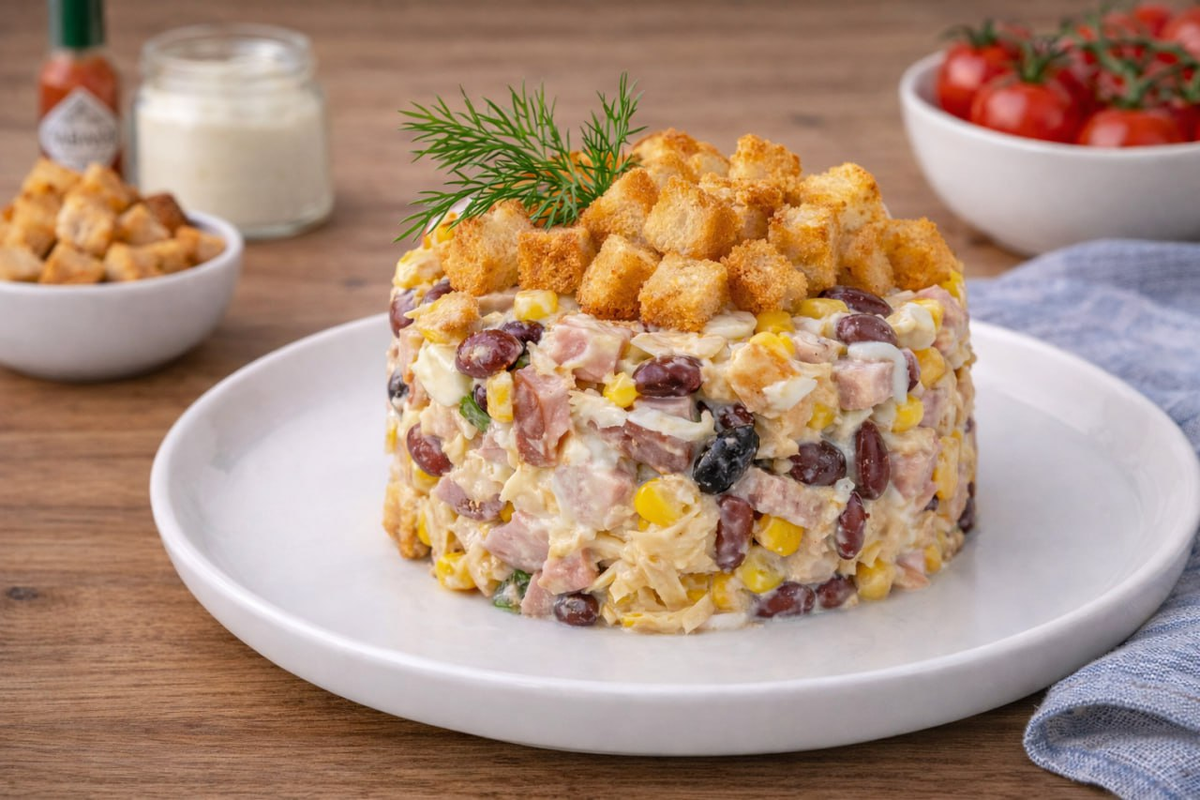 Простой салат с чесночным ароматом и хрустом, который всегда удается и красиво смотрится на праздничном столе