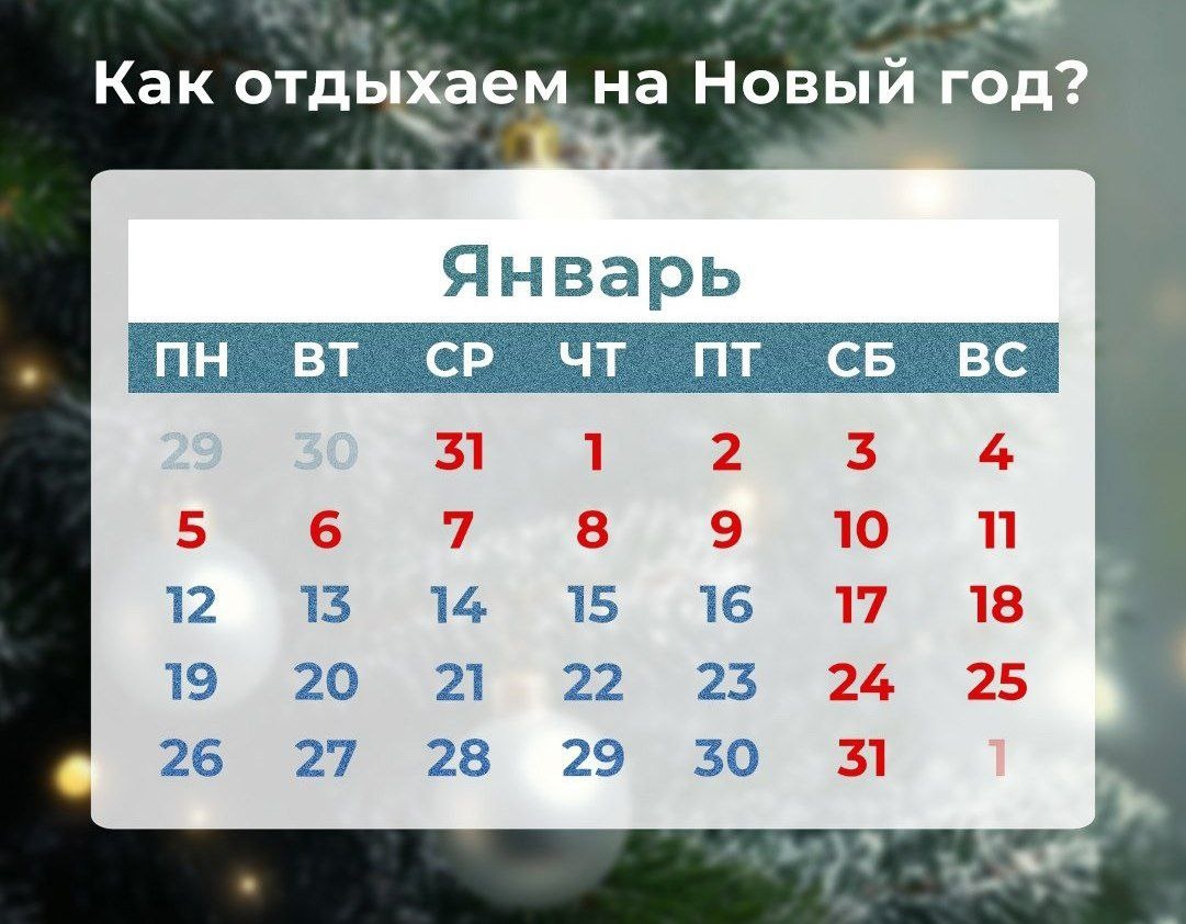 ? В этом году нас ждут длинные новогодние каникулы — целых 12 дней. 📆 Отдыхаем с 31 декабря по 11 января включительно. А на работу выходим 12 января, в понедельник.