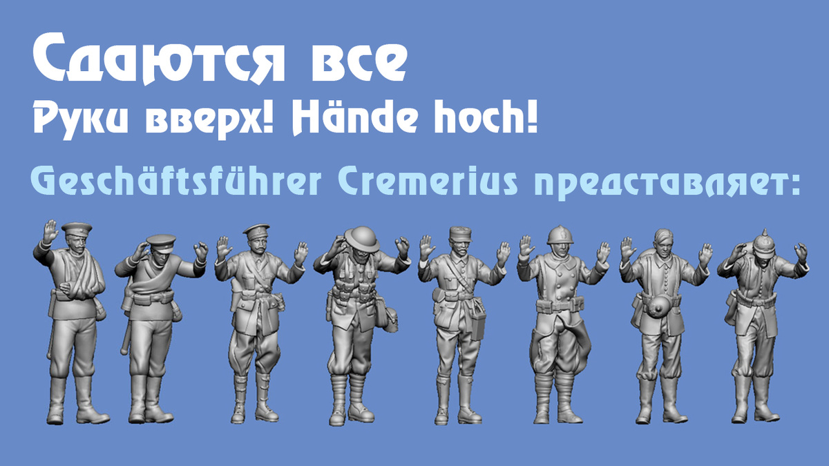 Но смотрю наборы солдатиков других армий, и там тоже есть сдающиеся в плен. И немцы «Deutsche Infanterie 1914/15 IX», и французы «Französische Infanterie 1915/18 IX», и британцы «Britische Infanterie 1914 / 1918 Gefangene». Всё по-честному! Фигурки изготовлены в масштабе 1:72, каждый набор стоит 16 евро.