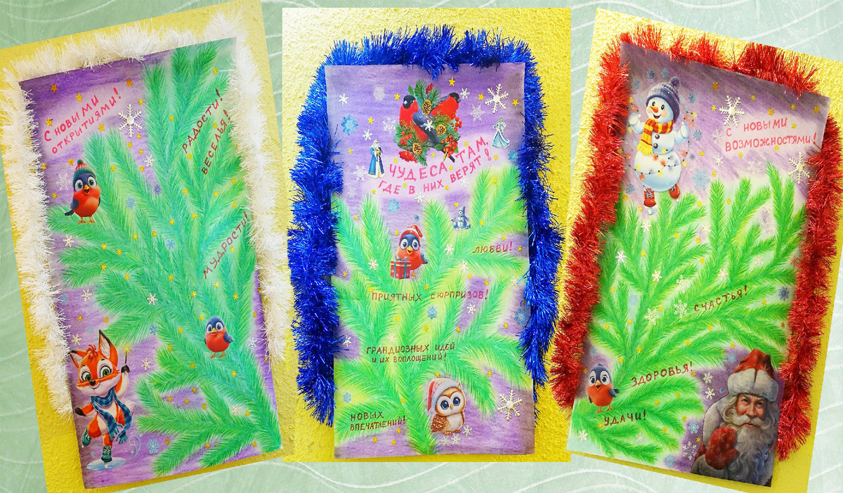 Наношу надпись таким же карандашом и фону придаю цвет, немного затемняя края для придания объема, живости, визуальной законченности: Получаю триптих: Заливаю лаком для пастели. После этого можно еще раз другим оттенком зеленого придать пышность еловым веткам, прорисовав иголки.