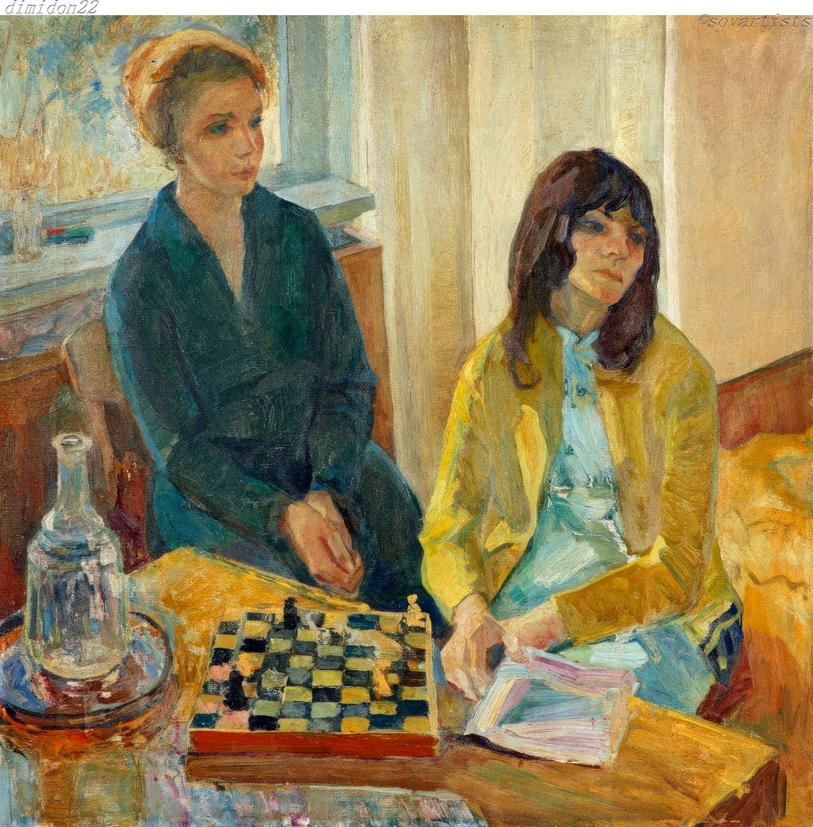 Красовский Евгений Евстафьевич (16(29).11.1908, Баку - 14.07.1980, Минск). «Игра в шахматы». 1976 год. Холст, масло, 80 х 80 см.; (© Галерея искусств ‹‹Предместье››, Минск).
