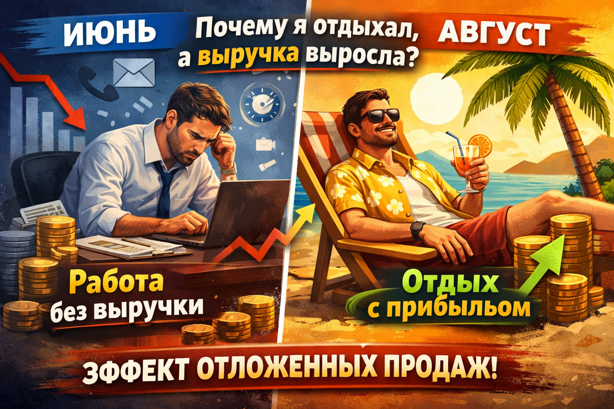 отпуск, дороги, солнце, минимум рабочих чатов, никакой операционки. Только частичная работа с текущими клиентами через помощников. Итог — выручка в несколько раз выше, чем в июне. Логичный вопрос: как это вообще возможно? Большинство предпринимателей совершают одну и ту же ошибку: