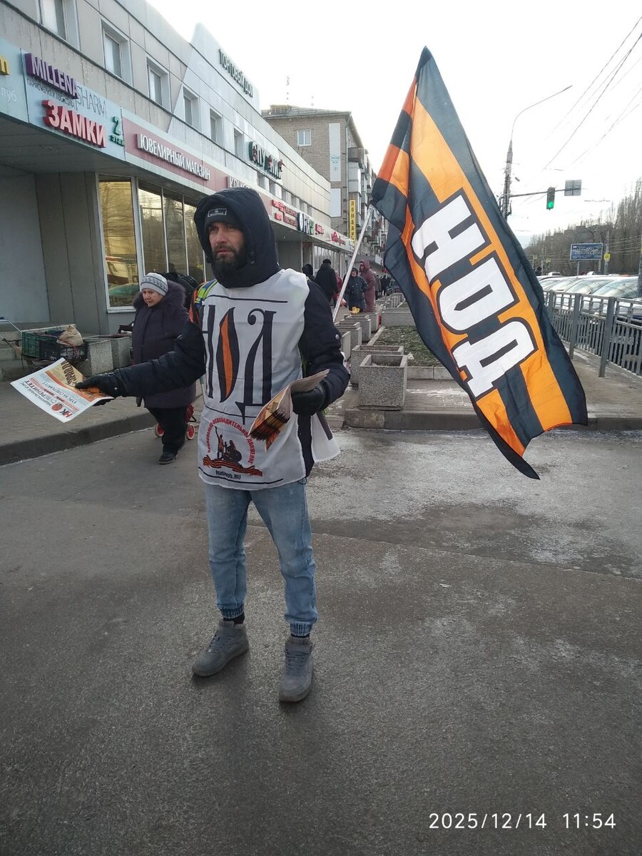 14 декабря 2025 активисты Воронежского Штаба НОД Воронеж-Юг провели одиночный пикет у рынка «Придача» в поддержку курса Путина В