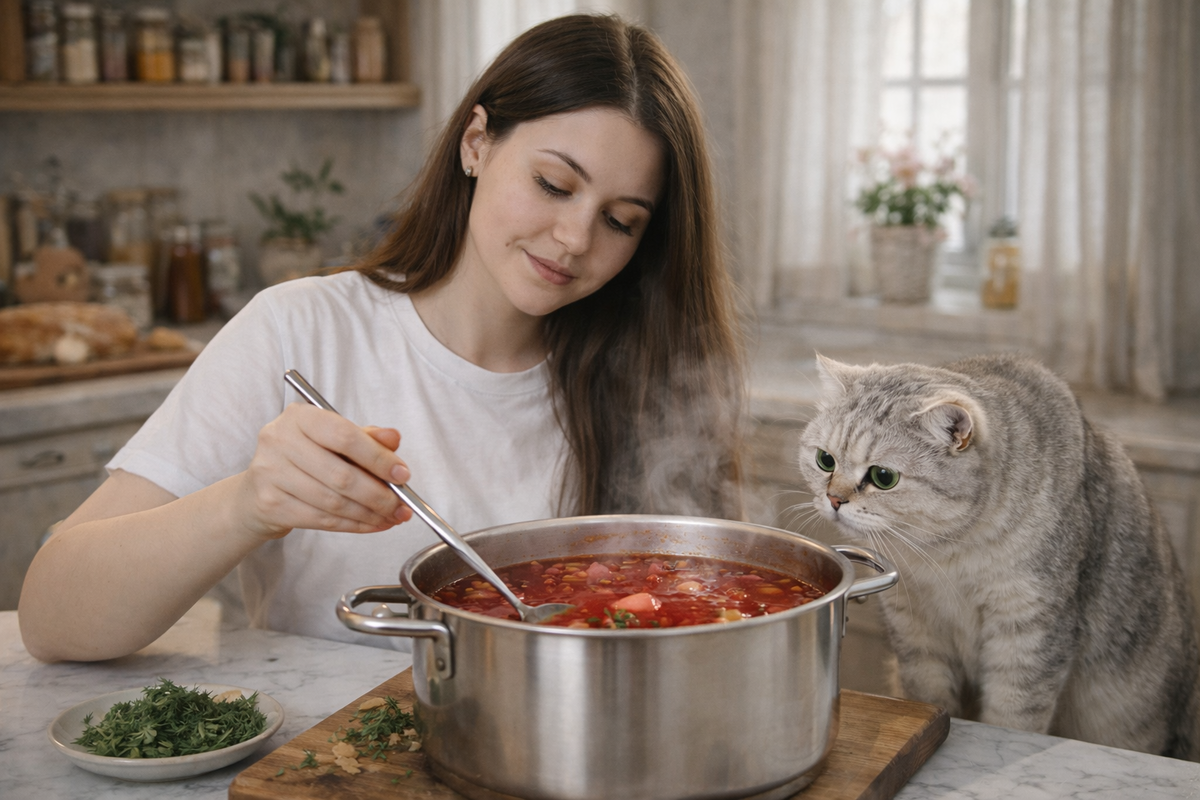 Добавить в борщ, перемешать и сразу выключить огонь. Обязательно дать борщу настояться 20–30 минут под крышкой.