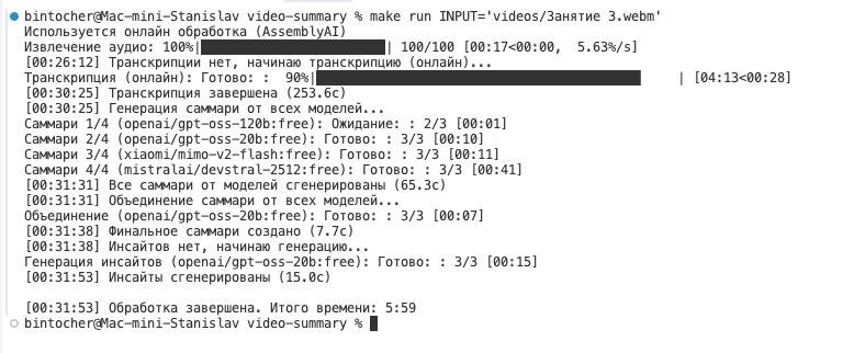 ). На выходе дает саммари из видео. Видео в 3,5 часа обрабатывается почти 6 минут. - Если на входе ссылка → скачиваем видео через yt-dlp в папку videos - Если локальный файл → используем существующий файл - С помощью ffmpeg извлекаем аудио в MP3 - Отправляем MP3 в AssemblyAI API и получаем транскрипт с метками спикеров(диаризация) и временными метками - Для оффлайн используем Whisper для транскрипции, и pyannote.audio для разделения по спикерам (диаризация) - Отправляем полный текст транскрипта в OpenRouter API (используем только бесплатные модели для саммари и инсайтов) для каждой модели: - openai/gpt-oss-20b:free - xiaomi/mimo-v2-flash:free - mistralai/devstral-2512:free - Получаем саммари от каждой модели - Отправляем все саммари от моделей в OpenRouter API, объединяем в одно финальное саммари - Отправляем полный текст транскрипта в OpenRouter API, получаем ключевые инсайты - Формируем итоговый файл с саммари и инсайтами
