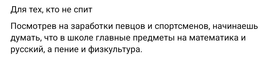🤔 И вот что-то мне кажется, что одна из главных проблем в нашей школе заключается в этом дурацком делении предметов на главные и неглавные. Когда-то, когда их все вводили, каждый предмет имел определенный практический смысл — он развивал "свою" часть мозга, и в этой связи одинаково важной была и алгебра с началами анализа (да-да, никакой другой особой пользы от этой дисциплины среднестатистическому человеку не задумывалось, кроме развития абстрактного мышления высокого уровня), и музыка, т.к. каждая отвечала за свое. Но потом кто-то "умный" решил, что музыка — это так, баловство, кто-то другой не менее одаренный решил, что и изо — ерунда, преподавать которую может и физкультурник (клянусь, в пятом классе у меня так и было!), да и физкультура утратила всякое понятие о культуре и превратилась в сдачу нормативов, et cetera, et cetera... И разностороннее развитие и образование подрастающего покаление редуциповалось до подготовки к ОГЕ и ЕГЭ. Такая печаль 😥 Или вы согласны, что не вс