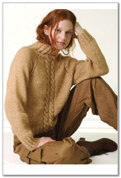 Красивый цвет, центральные косы, реглан. Отличный свитер для прогулок в прохладное время года. Вяжется сверху вниз в круговых рядах на круговых спицах в одном полотне, начиная с воротника, распределяя прибавки вдоль кос до достижения рукавов, которые откладываются и вяжутся позже.