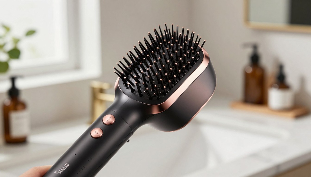 Профессиональное и гладкое изображение ионизирующего выпрямителя для расчесок Tuvio HBI1413. Основное внимание уделяется расческе, демонстрируя ее эргономичный дизайн, щетинку и функцию ионизации, элегантно отображаемую на переднем плане. Кисть должна иметь глянцевую отделку и располагаться под небольшим углом, чтобы подчеркнуть ее контуры. Мягкое, теплое освещение усиливает отражающие поверхности, создавая современную и привлекательную атмосферу. В середине включите тонкую, размытую установку тщеславия с зеркалом и другими инструментами для укладки волос, намекая на косметическую рутину. На заднем плане изображена слегка освещенная ванная комната или гардеробная, добавляющая глубину, не отвлекая от основной темы. Общее настроение должно вызывать чувство изысканности и полезности в уходе за волосами.