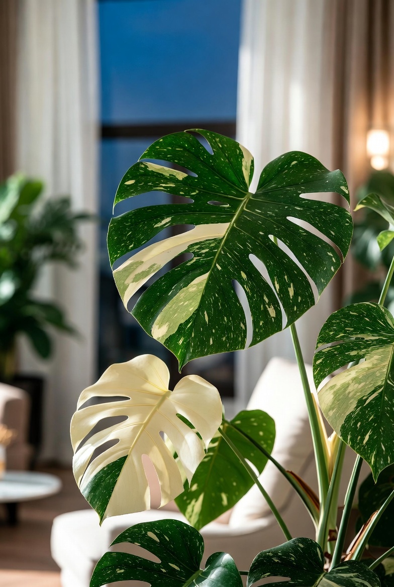Главная ошибка в уходе за вариегатной монстерой — попытка компенсировать белые участки «максимальным светом». Растению нужен яркий, но строго рассеянный свет.