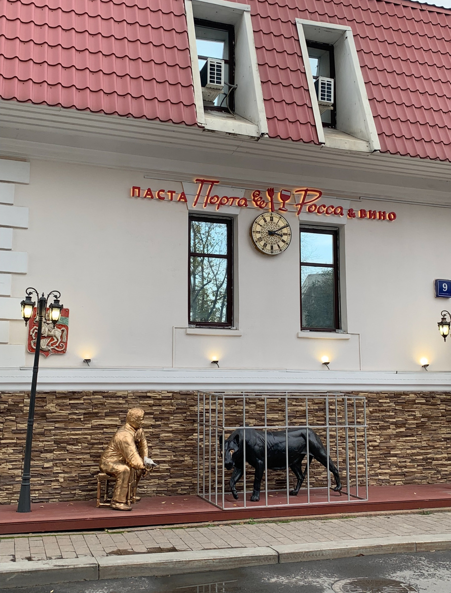 Была как-то на экскурсии в высотке на Красных воротах и обратила внимание на небольшой дом по-соседству около которого была интересная инсталляция: золотой мужчина сидит на стуле и держит голубя, а напротив него клетка с черной пантерой.
