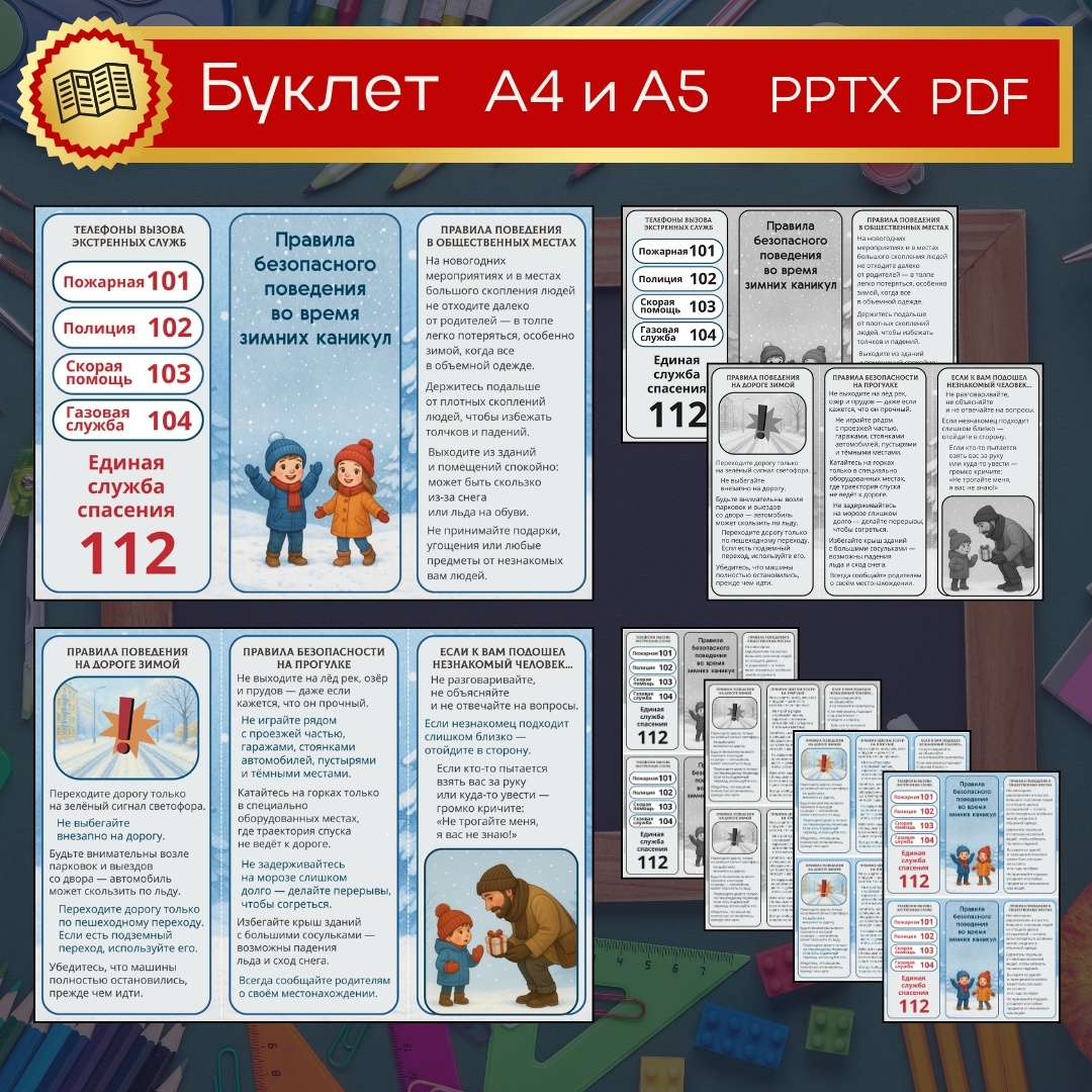 Буклет «Правила безопасного поведения во время зимних каникул» создан для классных руководителей для проведения классного часа. Буклет поможет напомнить детям нормы безопасности в сезон морозов и новогодних мероприятий. В буклете собраны правила поведения в общественных местах, рекомендации по безопасности на дороге зимой, правила поведения на прогулке, советы, что делать, если подошёл незнакомец. Крупным шрифтом размещены телефоны экстренных служб. В комплект входят версии под печать A4 и A5. Буклет понятен школьникам любого возраста. Пригодится: Буклет может использоваться как самостоятельное пособие или как дополнение к презентациям и урокам по профилактике несчастных случаев в зимний период. Вам пригодится: