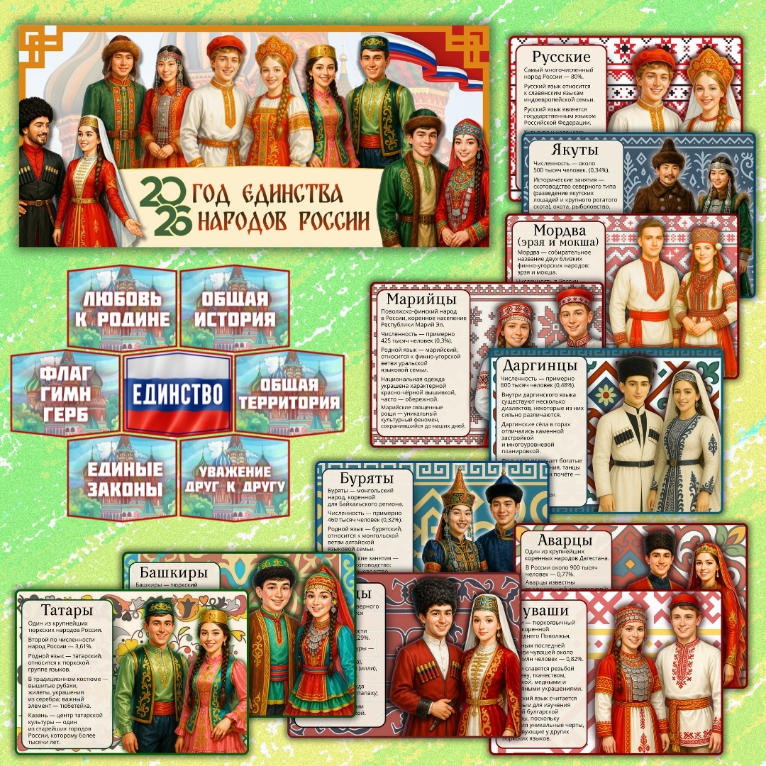 Этот набор станет готовым решением для создания яркого, патриотического и современного оформления, которое будет служить образовательным инструментом, помогающим детям лучше понимать культуру и традиции народов России.