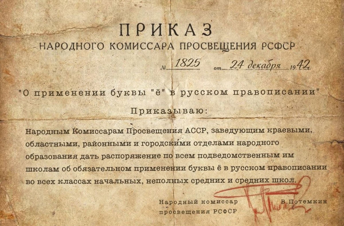 24 декабря 1942 - Нарком просвещения РСФСР Владимир Потемкин подписал приказ № 1825 об обязательном употреблении буквы «ё