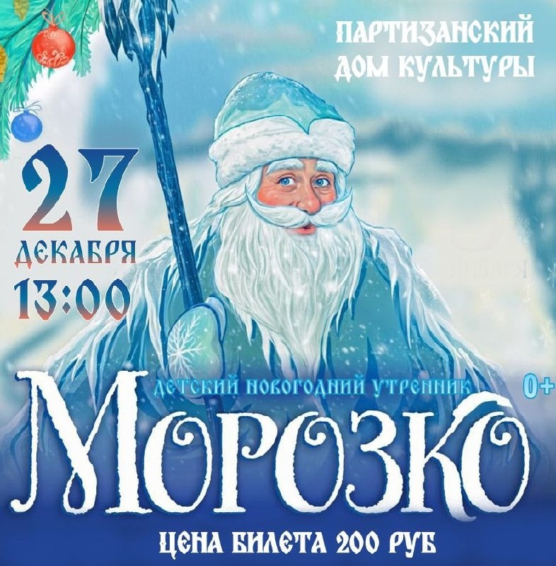 Партизанский Дом культуры приглашает юных зрителей и их родителей на детский новогодний утренник «Морозко». Праздничное представление пройдет 27 декабря в 13:00. Организаторы обещают зрителям волшебное путешествие в мир сказки с увлекательными приключениями и яркими эмоциями в преддверии Нового года. Стоимость билета составляет 200 рублей. Для многодетных семей предусмотрена льготная цена — 100 рублей при предъявлении удостоверения. Дети участников специальной военной операции смогут посетить мероприятие бесплатно. Дополнительную информацию можно получить по телефону: 8 (391) 402-11-08. 🌐 Сайт | 📱 Telegram | 📱 ВК | 📱 ОК | 📱 Дзен