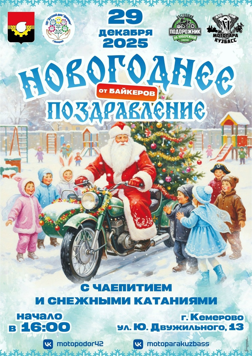 детских домов нашего города. Давайте не прерывать эту традицию - подарим ребятам небольшой праздник! Предлагаем 29 декабря собраться в 16-00 на территории детского дома «Доверие» по адресу: г.Кемерово, ул.Двужильного, д.13. Поздравим ребятишек, покатаем на мотоциклах (при возможности), подарим новогодние подарки. Огромная просьба поддержать эту инициативу. Сбор средств на подарки осуществляется на отдельную карту СБЕРбанк, номер карты 2202202118241037 (получатель Игорь Владимирович), пометка «Детдом». P.S. Дата выбрана не случайно, т.к. в выходные у ребят плотный предновогодний культурный график! https://vk.com/motopodor42 https://vk.com/motoparakuzbass