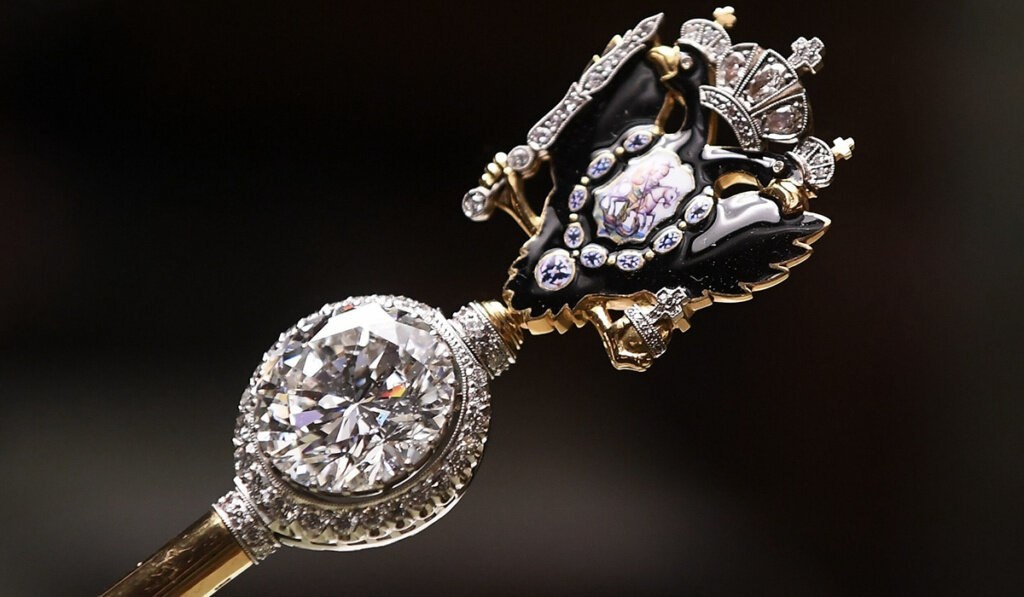 Знаменитый Орлов. Алмаз «Орлов» драгоценный камень индийского происхождения, огранённый алмаз слабого зеленовато-синего оттенка. Крупнейший из найденных в Индии, алмаз был обнаружен в районе Голконды, принадлежал Великим Моголам и Персидским шахам. После убийства Надир-шаха его алмаз был украден. Молва об этом редчайшем из редких бриллиантов распространилась по коридорам королевских семей Европы. Вскоре об этом узнала Екатерина Великая. Она отправила на поиски графа Григория Орлова, человека, который помог ей взойти на престол, ее ближайшего наперсника, ее любовника и человека, полностью преданного Екатерине.Орлов направился в Амстердам, где в 1774 году ему наконец удалось раздобыть для нее драгоценный камень. Екатерина была очарована сокровищем, великолепной оригинальной огранкой бриллианта в стиле могольской розы, 180 острых граней, отражающих даже малейший отблеск света, освещали целые комнаты, а нежный голубовато-зеленый оттенок поднимался из его глубины. Екатерина назвала его