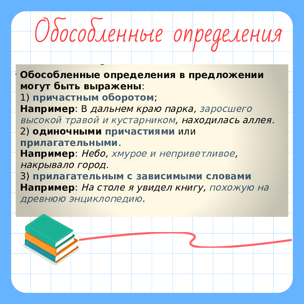 Обособленное определение может быть выражено: ✔️Причастным оборотом (пример: Лес, скинувший осеннюю листву, казался прозрачным) ✔️Прилагательным с зависимыми словами (пример: Деревья, серебряные от инея, торжественно встретили утро) ✔️ Несколькими прилагательными (пример: За распахнутым окном был слышан детский смех, звонкий и заразительный). ❗ Но иногда при разборе предложения возникают затруднения: ребенок не может отличить причастие от отглагольного прилагательного. В этом нам поможет вот такая шпаргалка Основные случаи обособления 1. Когда определяемое слово выражено личным местоимением Радостный и взволнованный, он бежал домой. (Н.В. Гоголь) 2. Определение выражено причастным оборотом и стоит после определяемого слова Оглушенный тяжким гулом, Теркин никнет головой. (А. Т. Твардовский) 3. Определение выражено причастным оборотом, стоящим перед определяемым словом, и имеет добавочное обстоятельственное значение Оглушенный падением, Григорий еле поднялся на ноги. (М. Шолохов)