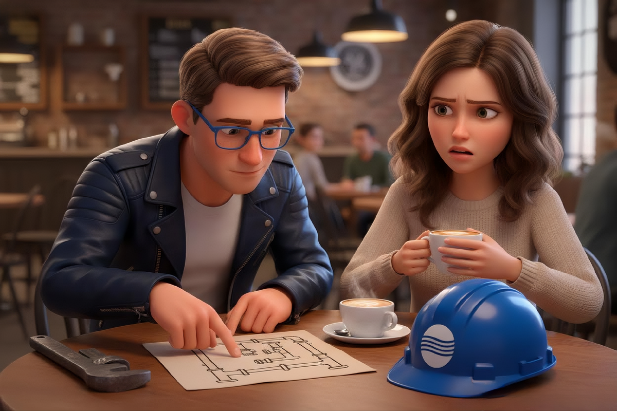 Кафе в Китай городе. Первое свидание с сайта знакомств. Мужчина в синей куртке, каска аккуратно лежит на столе рядом. Девушка с капучино и внимательно слушает.